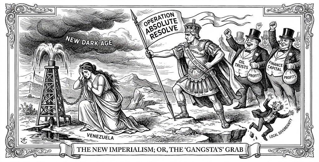 While awful and terrifying, there is something at least clarifying about this “extreme gangsta” moment in American life and American history. While many commentators express outrage at the aberrant lawlessness of Trump’s blatant imperialism, decrying his attack on Venezuela as a break from the past, one could just as easily focus on the continuities and familiar historical patterns. By bypassing Congressional oversight and international law to seize direct control of foreign assets, the Trump regime has signaled that the “New Dark Age” involves the end of the old international order along with a return to a raw, resource-based imperialism. In what follows, I am going to review some of the historical and immediate context that led to Operation Absolute Resolve, saving my commentary for upcoming columns.