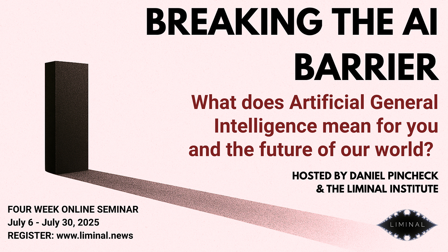 The arrival of synthetic super-intelligence brings both unprecedented potential and catastrophic risk, threatening to deconstruct, redesign, and transform reality as we have known it until now. Breaking The AI Barrier is a four-week online seminar offers a unique synthesis of philosophical inquiry, historical and mythic insight, critical analysis, and pragmatic techniques to help you comprehend and navigate what may be one of the most significant transitions in human history. The seminar provides guidance on the crucial question of our time: How do you navigate a world of synthetic super-minds?