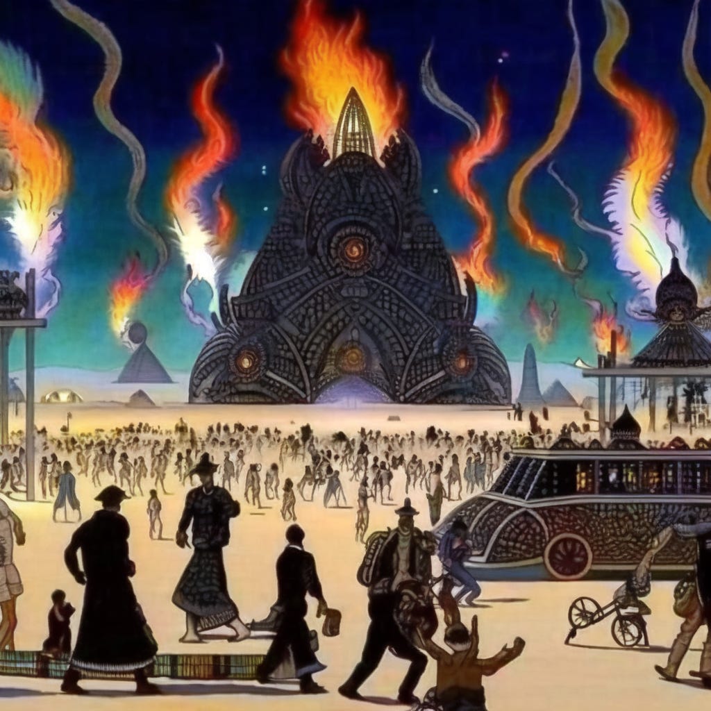 A group of artists and occultists, including the West Coast Cacophony Society, started Burning Man. From its origins, it can be seen as an “occult working,” a more or less deliberate summoning. The founders devised something like a new cult or postmodern religion, with particular rituals and mantras. The roots of Burning Man lead back to the ‘60s counterculture, the Leary/McKennna psychedelic lineage, Crowley’s OTO and Chaos Magic, as well as Silicon Valley’s tech idealism. Whatever was summoned forth from the event’s origin has evolved into a potent social force — but, I feel, a problematic one.