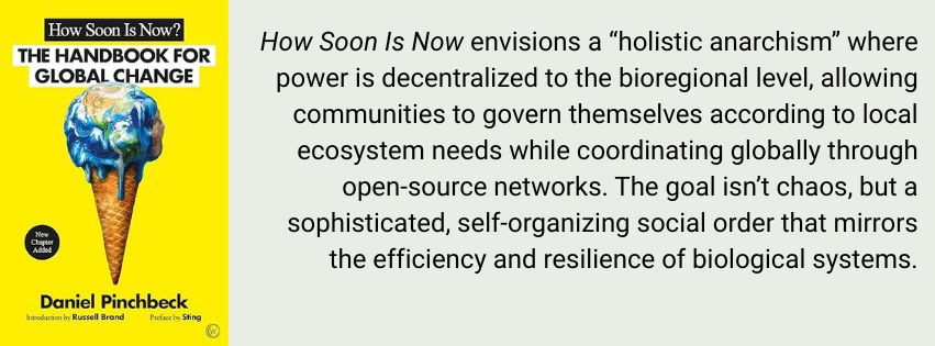 Ultimately, How Soon Is Now? offers a blueprint for a society that creates abundance through sharing rather than extraction—a world where technology serves ecology, economy serves community, and politics serves the liberation of the human spirit. The path forward is to embrace the crisis as a prompt for our collective maturation. The destructive systems we’ve built are projections of our own unhealed psyches. We need to heal ourselves and our relationships to heal the world, but, also, healing is a never-ending process, and healing becomes a bit of a fixation for many people who should reach a point where they feel “healed enough” to shift from self care to service for the collective.