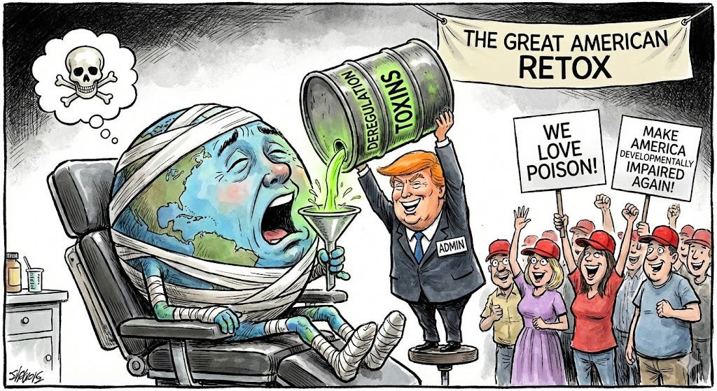 I realize that the never-ending onslaught of horrible news is a “flood the zone” strategy on the part of the despotic regime as Trump and his cronies take a sadistic pleasure in violating every norm and attacking every cherished ideal held by Americans through our checkered history, such as free speech and Constitutional protections, as they seek to build an AI-enabled dictatorship that protects the interests of a tiny few against the many. In fact, I meant to write about this issue of chemical poisoning for months now, but my attention kept getting fragmented, pinwheeled by some other stray horror. Today I will focus on this area, finally giving it its due.