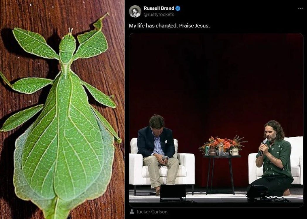 I find it possible this—absorption or “convulsive possession” by space—has happened in Russell’s case, which doesn’t mean I absolve him of personal responsibility for his disgraceful descent. He willfully chooses to confuse an internal process of depersonalization/nihilism (a.k.a. “midlife crisis”) with some kind of religious awakening. The Internet media-sphere is also a kind of “space,” a psycho-cognitive Topos, and Russell’s ravenous, constant effort to assimilate whatever issue or “hot take” boosts his instant engagement and revenue have led to schizop-mimetic “depersonalization,” his “becoming-ghost,” now on sad display.